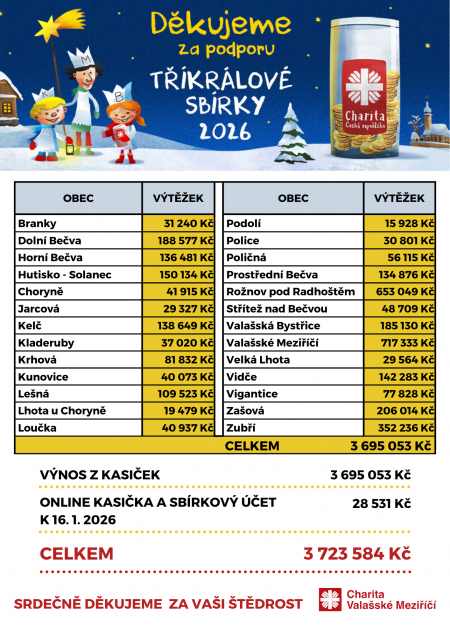 Celkový výtěžek Tříkrálové sbírky 2026 tak činí úžasných 3 723 584 Kč.